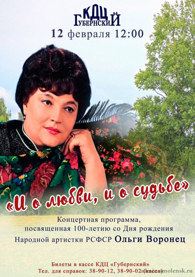 12 февраля мы отметим 100-летие со дня рождения нашей землячки, Народной артистки РСФСР, Почетного гражданина города Смоленска, легендарной исполнительницы эстрадных и русских народных песен Ольги Воронец.