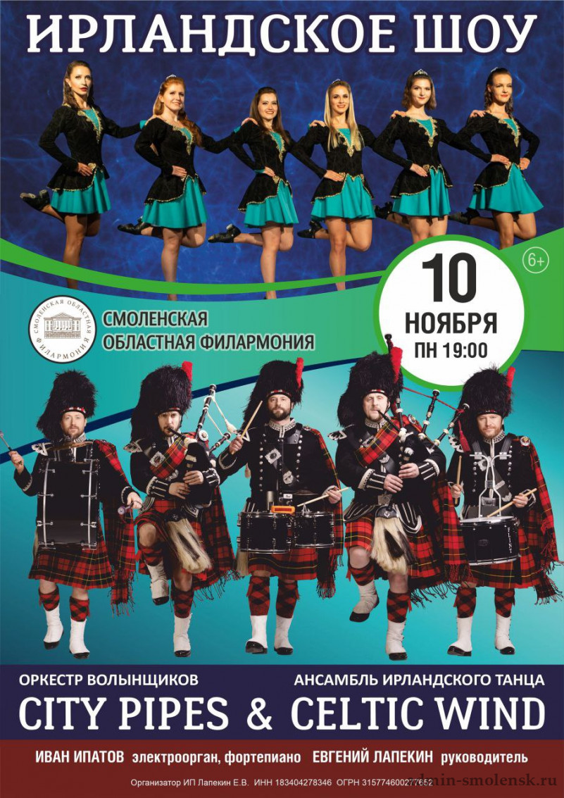 10 ноября в Смоленской филармонии представят яркое и динамичное музыкально-танцевальное шоу от оркестра волынщиков City Pipes совместно с ансамблем ирландского танца Celtic Wind!