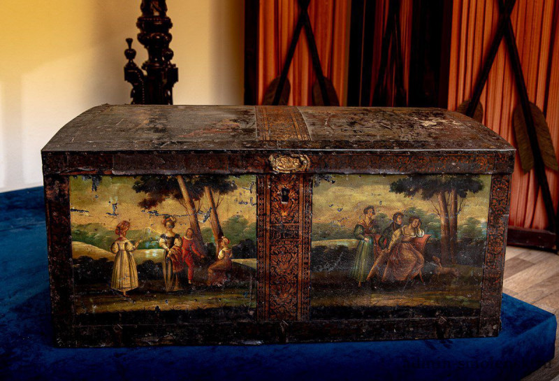 Наш артефакт родом из Нижегородской губернии. Сундук обит листовым железом и украшен живописными изображениями. На его крышке на бронзовой чеканной полосе указана дата изготовления - 1839 год.