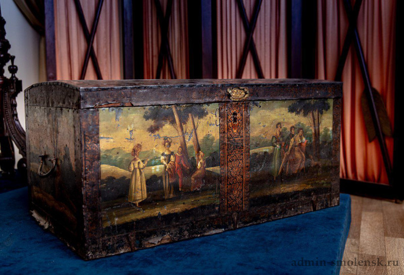 Наш артефакт родом из Нижегородской губернии. Сундук обит листовым железом и украшен живописными изображениями.