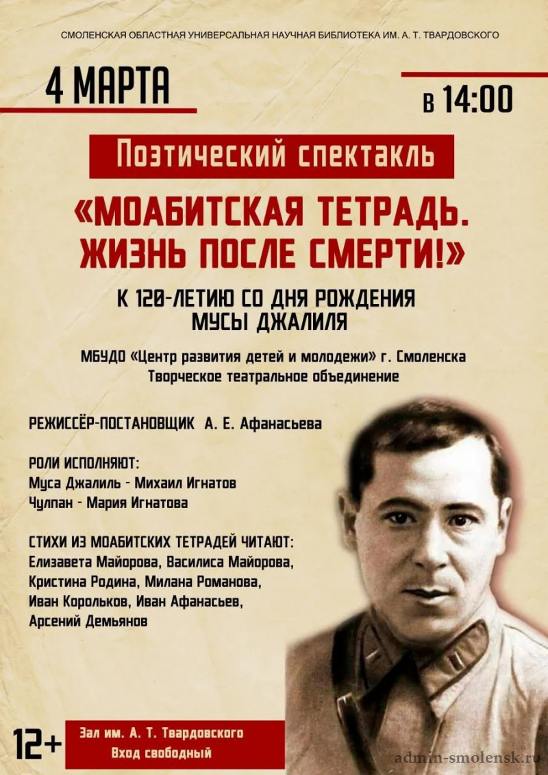 В среду, 4 марта, наши коллеги приглашают смолян и гостей города на поэтический спектакль "Моабитская тетрадь. Жизнь после смерти". Этот цикл стихотворений, переведённый более чем на 60 языков, Муса Джалиль создал в берлинской тюрьме Моабит в ожидании смертной казни. Для миллионов людей по всему миру они стали символом несгибаемого человеческого достоинства и патриотизма.