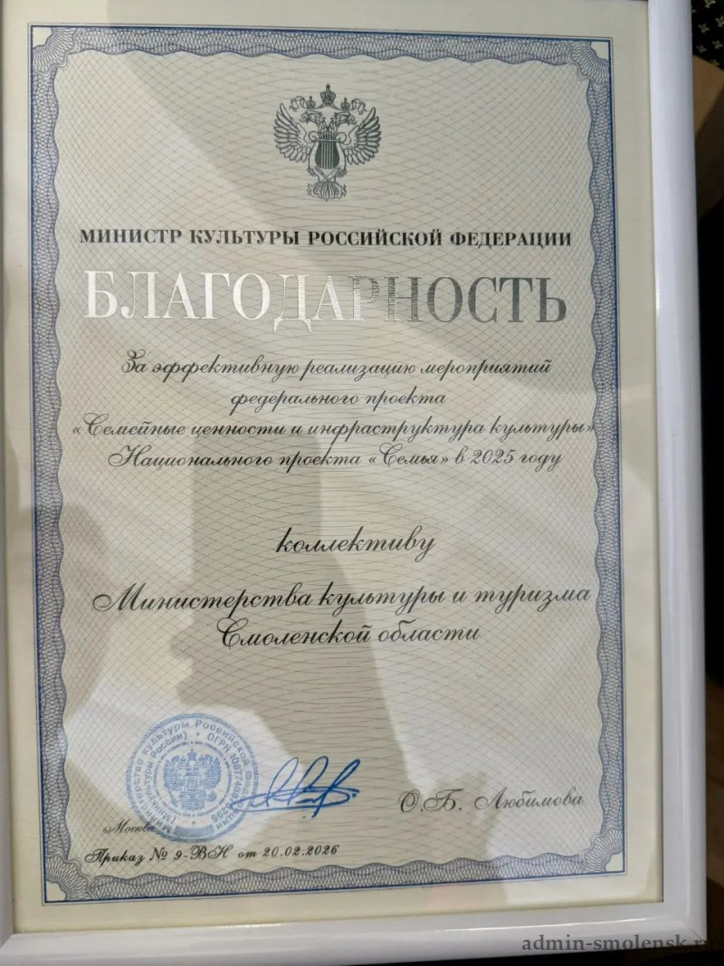 Коллектив регионального Минкульта удостоен Благодарности министра культуры России Ольги Любимовой за эффективную реализацию мероприятий федерального проекта "Семейные ценности и инфраструктура культуры" национального проекта "Семья" в 2025 году!