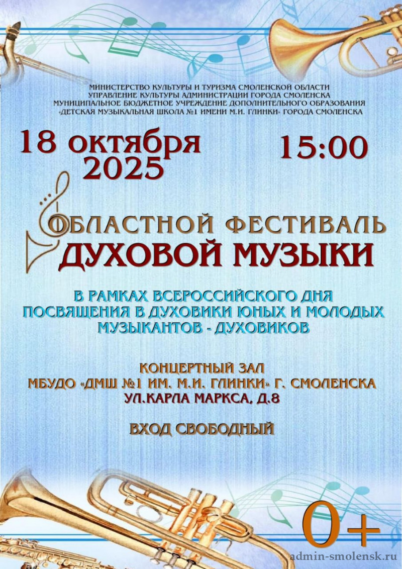 18 октября в 15:00 в МБУДО «ДМШ №1 им. М.И. Глинки» г. Смоленска состоится Областной фестиваль духовой музыки в рамках Всероссийского дня посвящения в духовики юных и молодых музыкантов-духовиков.