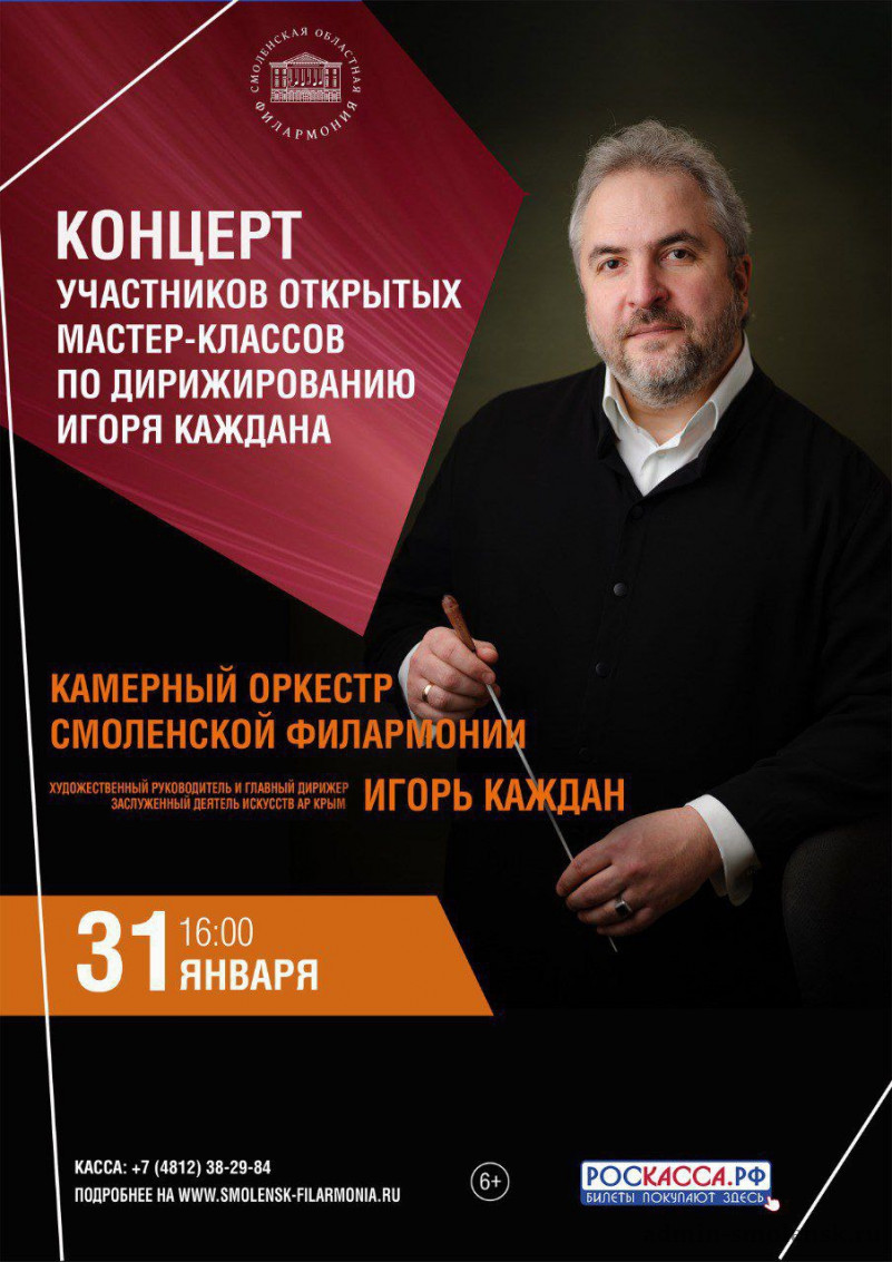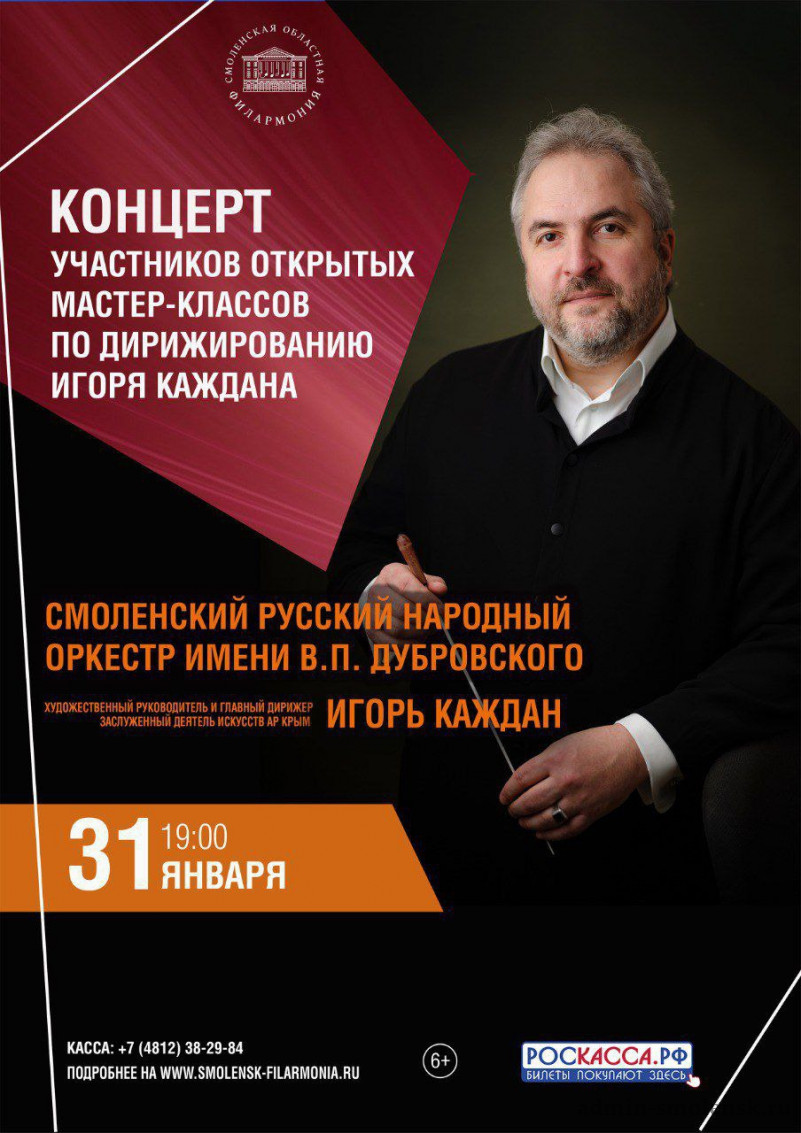 В субботу, 31 января, в областной филармонии состоятся концерты участников открытых мастер-классов по дирижированию Игоря Каждана - заслуженного деятеля искусств АР Крым, художественного руководителя и главного дирижера Смоленского русского народного оркестра им.В.П.Дубровского и Камерного оркестра Смоленской филармонии.