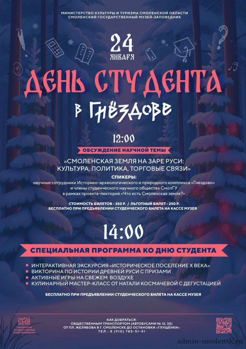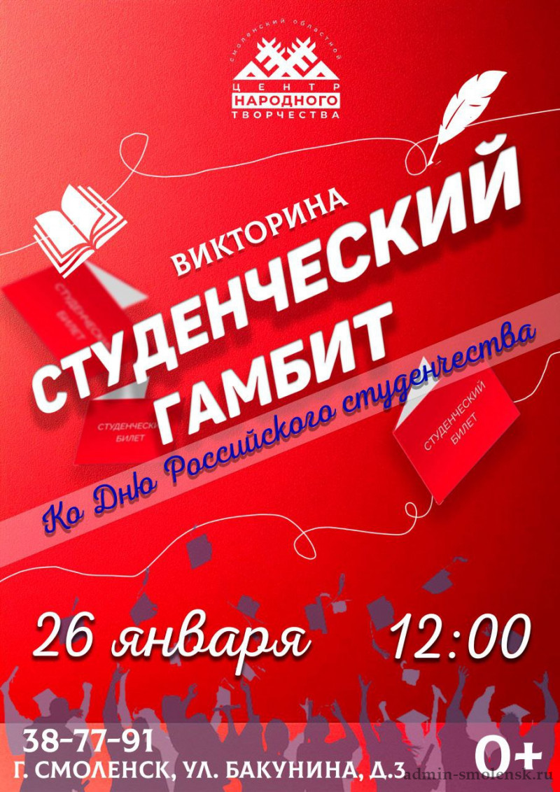Смоленск - Молодежная столица России-2026! А наша молодежь - самая активная, креативная и любознательная! Рассказываем, какие мероприятия, приуроченные к Дню российского студенчества, который мы отметим в это воскресенье, 25 января, пройдут в наших учреждениях культуры.