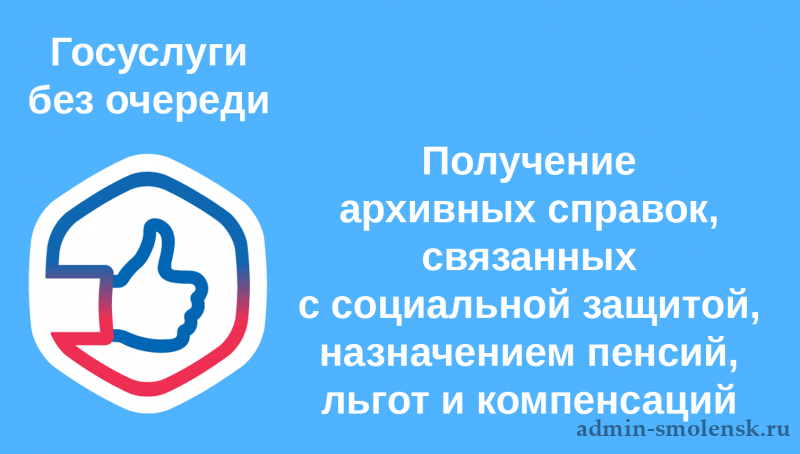 Министерство культуры и туризма Смоленской области сообщает о возможности получения услуги «Организация исполнения государственными архивами субъектов Российской Федерации запросов на получение архивных справок, архивных выписок и архивных копий, связанных с социальной защитой граждан, предусматривающей их пенсионное обеспечение, а также получение льгот и компенсаций в соответствии с законодательством Российской Федерации» в электронном виде с использованием федеральной государственной информационной системы «Единый портал государственных и муниципальных услуг» - http://www.gosuslugi.ru.
