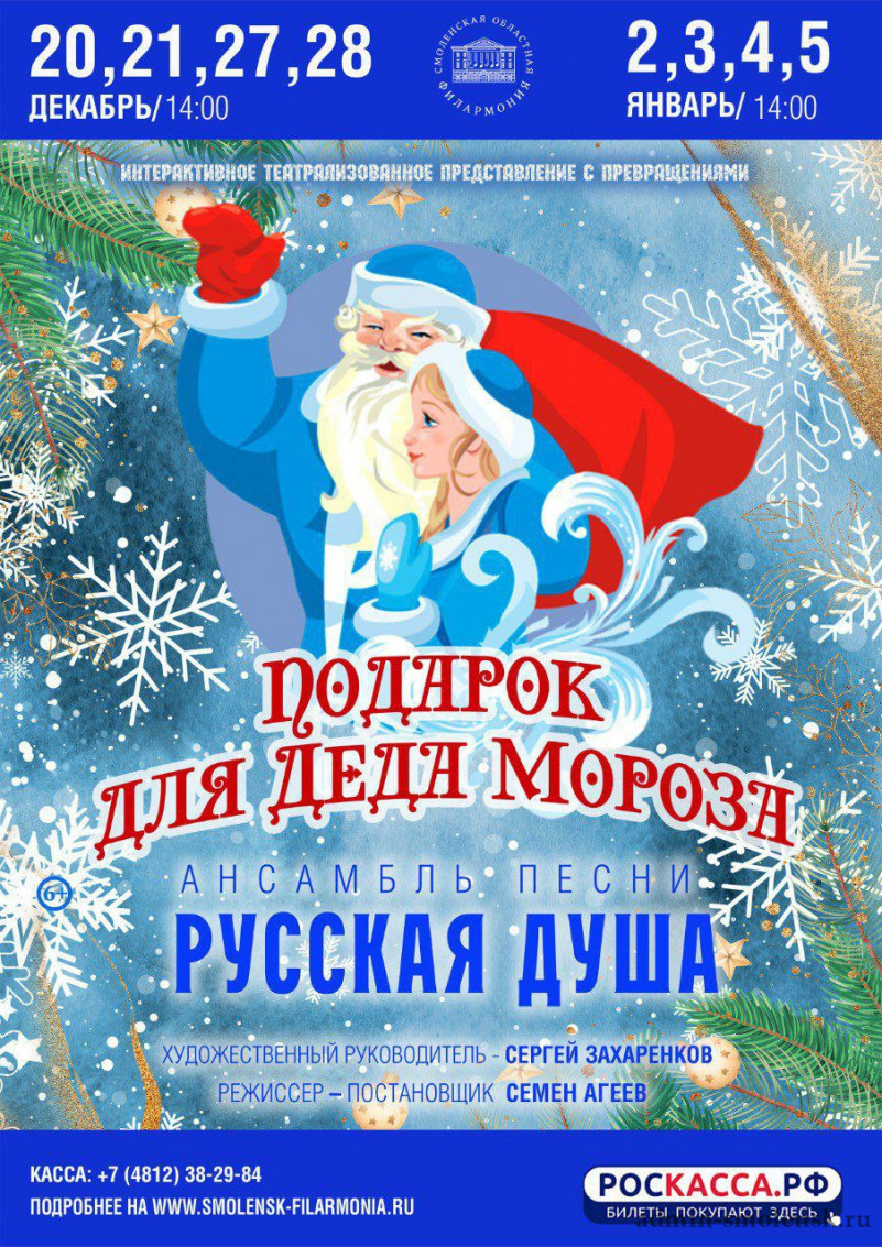 27, 28 декабря и 2, 3, 4, 5 января в 14.00 вас ждут на новогоднее интерактивное театрализованное представление с превращениями "Подарок для Деда Мороза" в исполнении артистов ансамбля песни "Русская душа".