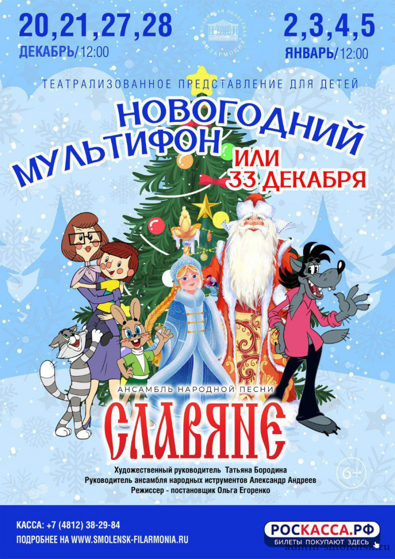 27, 28 декабря и 2, 3, 4, 5 января в 12.00 приходите на премьеру детской музыкальной сказки "Новогодний мультифон или 33 декабря" в исполнении ансамбля "Славяне".