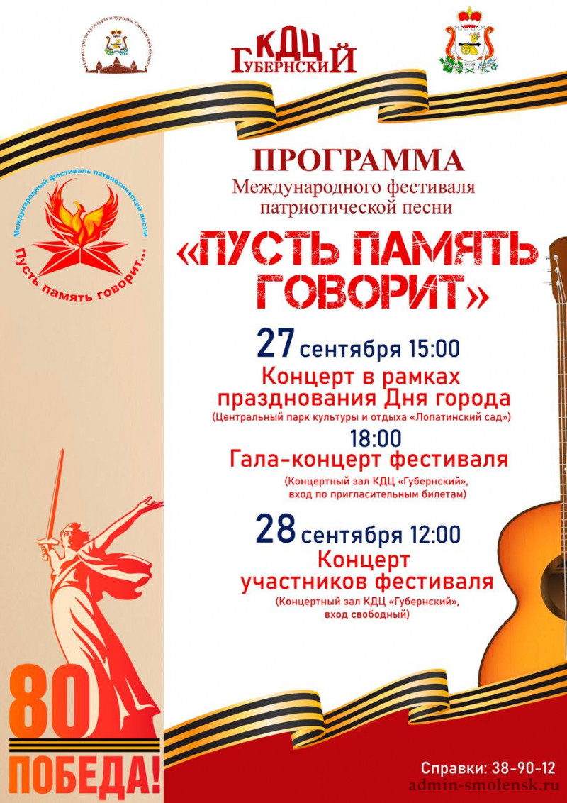 27-28 сентября в Смоленске пройдет VI Международный фестиваль патриотической песни "Пусть память говорит".