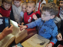 Также они побывали в кабинете редкой книги, где представлены уникальные издания, как старинные, так и современные. Библиографические раритеты поразили детей тряпичной бумагой с решеткой на страницах, видимой в свете фонарика. А вот издания XXI века удивили разнообразием своего полиграфического оформления и возможностью не только читать книги, но и слушать их.