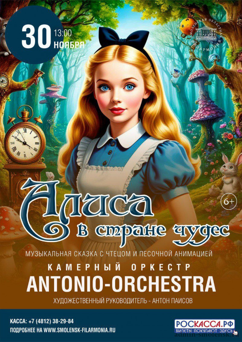 Живое звучание и мастерство музыкантов Камерного оркестра "Antonio-Orchestra" (Москва) под управлением художественного руководителя и дирижера Антона Паисова погрузит зрителей в атмосферу волшебной сказки про девочку Алису, которая неожиданно попадает из самой обычной обстановки в невероятный мир странных и причудливых людей и зверей.