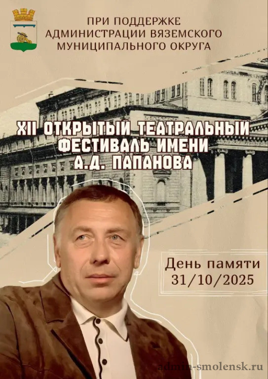 XII Открытый театральный фестиваль имени Анатолия Дмитриевича Папанова пройдет в Вязьме с 29 октября по 31 октября 2025 года.